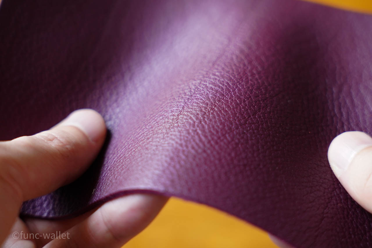 質感は一般的な革のイメージと異なると思います。うるし加工されていて、表面はカッチリと固い質感です。ところが、曲げるとしなやか。